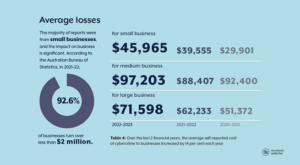 Small businesses, often the most vulnerable, reported average losses of AUD $45,965 due to cyber incidents, marking a significant rise from the previous year’s average of AUD $39,555. Medium-sized businesses were also hit hard, with reported losses averaging AUD $97,203, up from AUD $88,407. Even large businesses, with their substantial investments in cyber defences, weren’t immune, facing average losses of AUD $71,598, up notably from AUD $62,233.